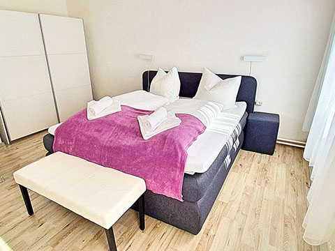Schlafzimmer: Boxspringbett, 2-türiger Kleiderschrank Sitzgelegenheiten und Kofferständer