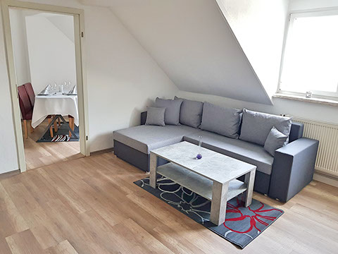 Wohnzimmer: ausgestattet mit Schlafsofa, Schreibtisch, Esstisch, SAT-TV